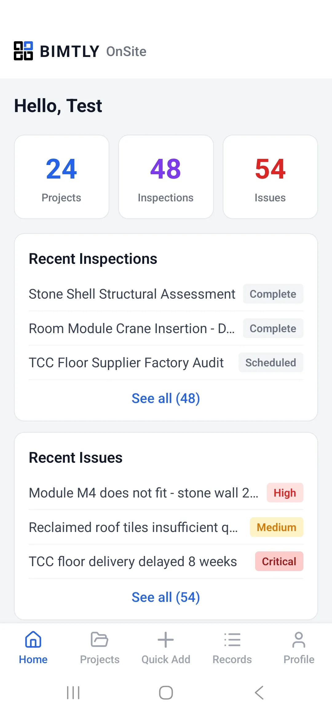- Project, inspection, and issue counts at a glance