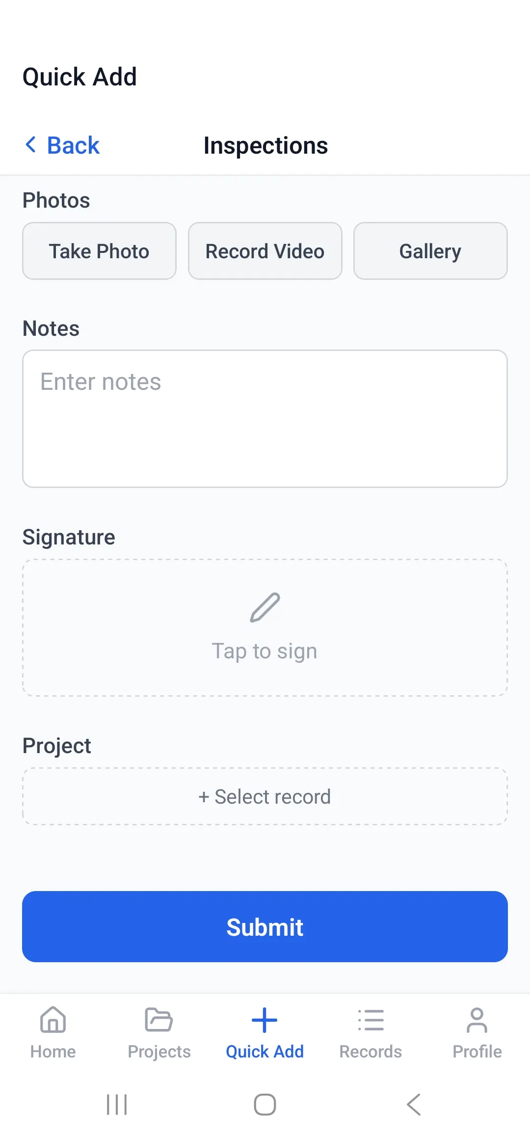 - Works fully offline — browse, capture, submit